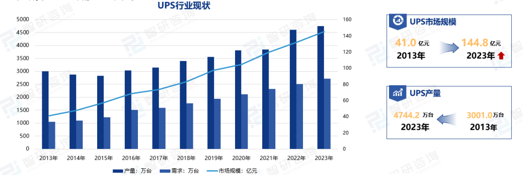過去UPS主要應用于工業制造領域,信息化建設拓寬UPS的應用范圍,隨著信息化廣泛應用于金融、教育、農業、軍工、新能源、電力等多個領域,以UPS為核心的數據中心產品市場需求不斷擴大。隨著全國性和區域性的綜合交通網基礎設施和物流需求的增加,交通總投資必然繼續保持增加,加之一帶一路、互聯互通、海外援建將帶來大量高端電源裝備的出口等,對高端電源裝備市場促進較為明顯。隨著各行各業對電力安全、電能質量及電能智慧管控等需求的不斷增長,我國UPS行業市場規模迎來穩步增長,2023年我國UPS產量達到4744.2萬臺,需求量為2713.1萬臺,市場規模144.8億元。